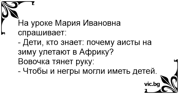На уроці природознавства вчителька запитує: — Хто знає, чому лелеки на зиму відлітають ув Африку? Встає Вовочка: — Ясна річ, негри також хочуть мати дітей!