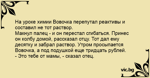 Макнул палец - и он перестал сгибаться. Принес он колбу домой, рассказал отцу. Тот дал ему десятку и забрал раствор. Утром просыпается Вовочка, а под подушкой еще тридцать рублей.