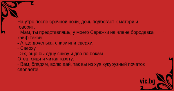 На утро после брачной ночи, дочь подбегает к матери и говорит: