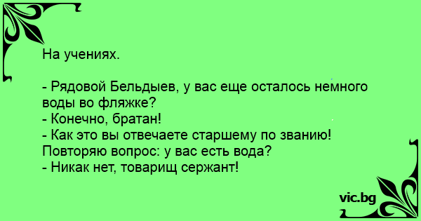 - Рядовой Бельдыев, у вас еще осталось немного воды во фляжке?