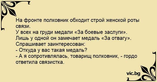 - А я сопротивлялась, товарищ полковник, - гордо ответила связистка.