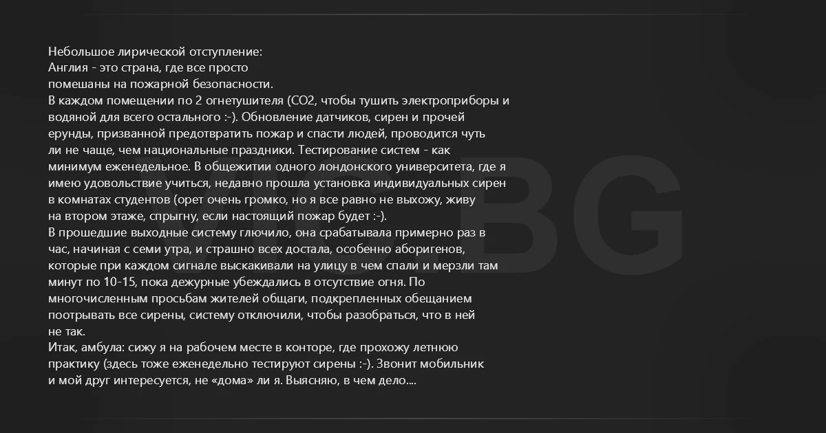 Небольшое лирической отступление: Англия - это страна, где все просто помешаны на пожарной безопасности. В каждом помещении по 2 огнетушителя (CO2, чтобы тушить электроприборы и водяной для всего остального :-). Обновление датчиков, сирен и прочей ерунды, призванной предотвратить пожар и спасти людей, проводится чуть ли не чаще, чем национальные праздники. Тестирование систем - как минимум еженедельное. В общежитии одного лондонского университета, где я имею удовольствие учиться, недавно прошла установка индивидуальных сирен в комнатах студентов (орет очень громко, но я все равно не выхожу, живу на втором этаже, спрыгну, если настоящий пожар будет :-). В прошедшие выходные систему глючило, она срабатывала примерно раз в час, начиная с семи утра, и страшно всех достала, особенно аборигенов, которые при каждом сигнале выскакивали на улицу в чем спали и мерзли там минут по 10-15, пока дежурные убеждались в отсутствие огня. По многочисленным просьбам жителей общаги, подкрепленных обещанием поотрывать все сирены, систему отключили, чтобы разобраться, что в ней не так. Итак, амбула: сижу я на рабочем месте в конторе, где прохожу летнюю практику (здесь тоже еженедельно тестируют сирены :-). Звонит мобильник и мой друг интересуется, не «дома» ли я. Выясняю, в чем дело. Оказывается, что он, покидая общагу часа 3 назад, оставил на включенной плите кастрюлю с каким-то варевом. Он пытался дозвониться до вахты общаги и по всем телефонам друзей, которые вспомнил - все безрезультатно, никто не ответил. Вспомнив про отключенную накануне пожарную сигнализацию, я уже стал представлять себе как пожарные поливают водой оплавленные останки моего ноутбука, будущую жизнь нелегала без паспорта и виз и т.п. Через полчаса перезванивает мой друг. Он умудрился вызвонить кого-то и уговорить проверить состояние дел на кухне, которая должна была уже полыхать синим пламенем. В результате выяснилось, что этот перец не только забыл кастрюлю на плите, но и забыл ее включить (!) Имени своего друга по понятным причинам не называю, очень умный парень, всю ночь перед происшествием просидел над книгами...