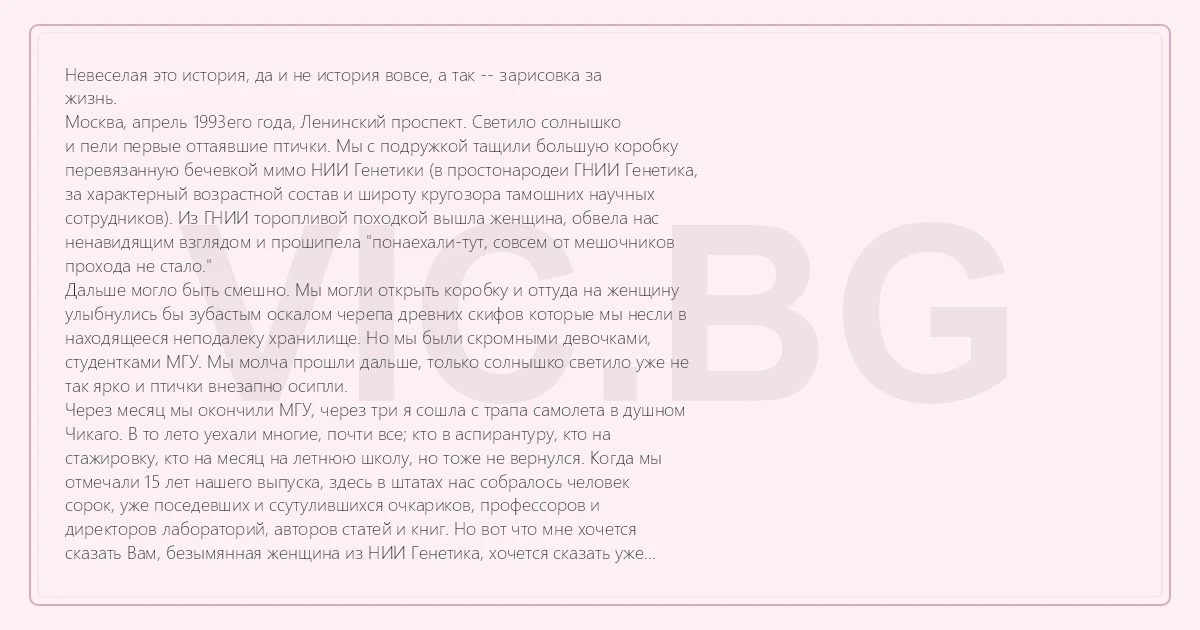 Невеселая это история, да и не история вовсе, а так -- зарисовка за жизнь. Москва, апрель 1993его года, Ленинский проспект. Светило солнышко и пели первые оттаявшие птички. Мы с подружкой тащили большую коробку перевязанную бечевкой мимо НИИ Генетики (в простонародеи ГНИИ Генетика, за характерный возрастной состав и широту кругозора тамошних научных сотрудников). Из ГНИИ торопливой походкой вышла женщина, обвела нас ненавидящим взглядом и прошипела "понаехали-тут, совсем от мешочников прохода не стало." Дальше могло быть смешно. Мы могли открыть коробку и оттуда на женщину улыбнулись бы зубастым оскалом черепа древних скифов которые мы несли в находящееся неподалеку хранилище. Но мы были скромными девочками, студентками МГУ. Мы молча прошли дальше, только солнышко светило уже не так ярко и птички внезапно осипли. Через месяц мы окончили МГУ, через три я сошла с трапа самолета в душном Чикаго. В то лето уехали многие, почти все; кто в аспирантуру, кто на стажировку, кто на месяц на летнюю школу, но тоже не вернулся. Когда мы отмечали 15 лет нашего выпуска, здесь в штатах нас собралось человек сорок, уже поседевших и ссутулившихся очкариков, профессоров и директоров лабораторий, авторов статей и книг. Но вот что мне хочется сказать Вам, безымянная женщина из НИИ Генетика, хочется сказать уже почти 20 лет. Я конечно не знаю как другие, но я уехала не из-за "мешочников", и даже не из-за угадываемого уже тогда развала-разрухи и распада науки. Я уехала из-за Вас.