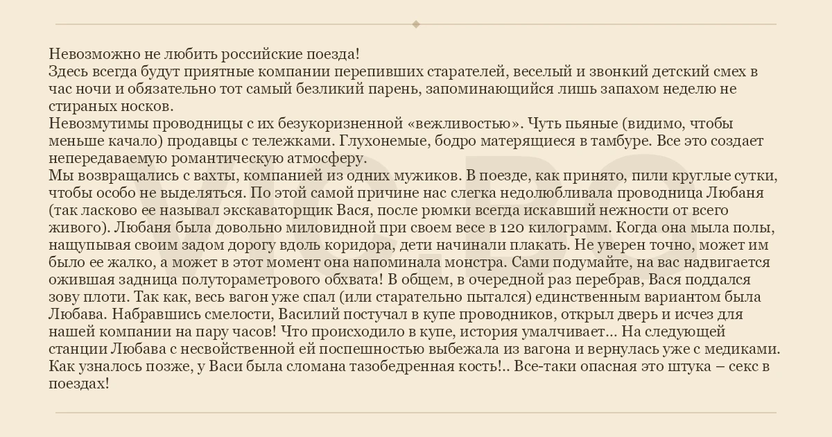 Мы возвращались с вахты, компанией из одних мужиков. В поезде, как принято, пили круглые сутки, чтобы особо не выделяться. По этой самой причине нас слегка недолюбливала проводница Любаня (так ласково ее называл экскаваторщик Вася, после рюмки всегда искавший нежности от всего живого). Любаня была довольно миловидной при своем весе в 120 килограмм. Когда она мыла полы, нащупывая своим задом дорогу вдоль коридора, дети начинали плакать. Не уверен точно, может им было ее жалко, а может в этот момент она напоминала монстра. Сами подумайте, на вас надвигается ожившая задница полутораметрового обхвата! В общем, в очередной раз перебрав, Вася поддался зову плоти. Так как, весь вагон уже спал (или старательно пытался) единственным вариантом была Любава. Набравшись смелости, Василий постучал в купе проводников, открыл дверь и исчез для нашей компании на пару часов! Что происходило в купе, история умалчивает… На следующей станции Любава с несвойственной ей поспешностью выбежалa из вагона и вернулась уже с медиками. Как узналось позже, у Васи была сломана тазобедренная кость!.. Все-таки опасная это штука – cekc в поездах!