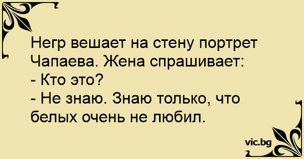 Негър окача портрета на Чапаев на стената. Жена му го пита: