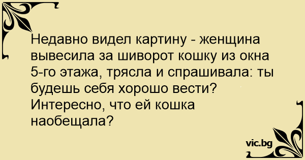 Недавно видел картину - женщина вывесила за шиворот кошку из окна 5-го этажа, трясла и спрашивала: ты будешь себя хорошо вести?