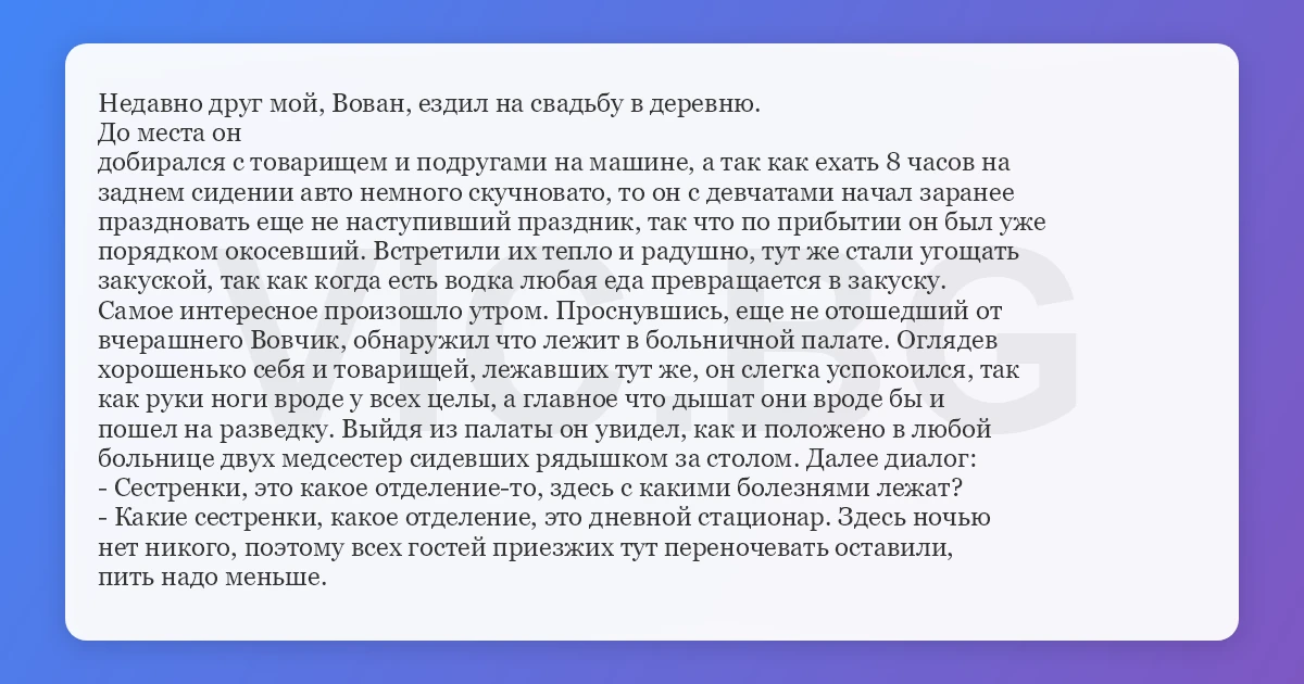 Недавно друг мой, Вован, ездил на свадьбу в деревню.
