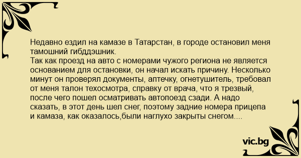 Недавно ездил на камазе в Татарстан, в городе остановил меня тамошний гибддэшник.