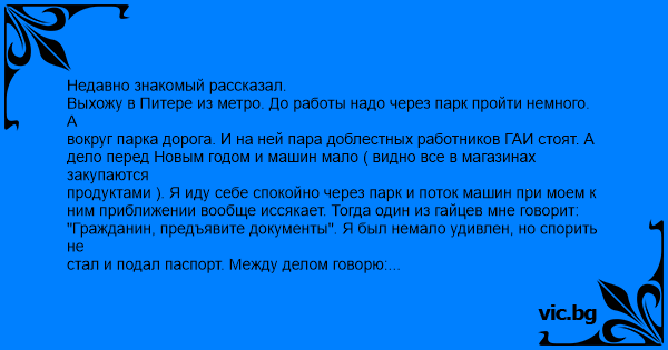 Недавно знакомый рассказал. Выхожу в Питере из метро. До работы надо через парк пройти немного. А вокруг парка дорога. И на ней пара доблестных работников ГАИ стоят. А дело перед Новым годом и машин мало ( видно все в магазинах закупаются продуктами ). Я иду себе спокойно через парк и поток машин при моем к ним приближении вообще иссякает. Тогда один из гайцев мне говорит: "Гражданин, предъявите документы". Я был немало удивлен, но спорить не стал и подал паспорт. Между делом говорю: "Ребята, я же вроде пеший". А мне отвечают:"Ты - пешеход, а, значит, участник дорожного движения, т.е. подпадаешь под нашу юрисдикцию". Он посмотрел и паспорт мне вернул. Я говорю: "Могу ехать?" Он смеется: "Езжай". Отошел и думаю, что хорошо не арестовали за ходьбу без прав.