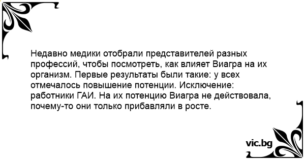 Недавно медики отобрали представителей разных профессий, чтобы посмотреть, как влияет Bиaгpa на их организм. Первые результаты были такие: у всех отмечалось повышение потенции. Исключение:
