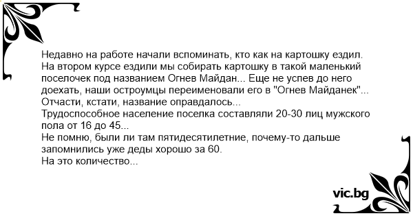 На втором курсе ездили мы собирать картошку в такой маленький поселочек под названием Огнев Майдан... Еще не успев до него доехать, наши остроумцы переименовали его в "Огнев Майданек"... Отчасти, кстати, название оправдалось...