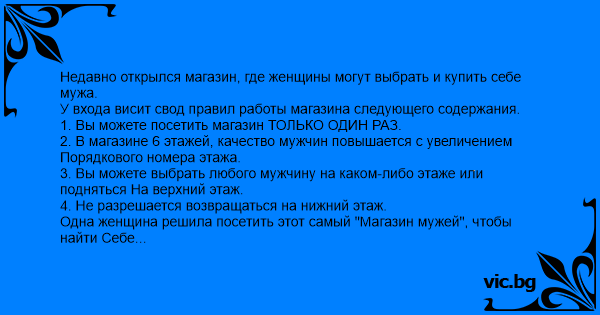 А прямо напротив этого магазина был открыт "Магазин жен". На первом Этаже находятся женщины, любящие заниматься сексом. На втором – богатые Женщины, любящие заниматься сексом. А на этажи с третьего по шестой ТАК Никто ни разу и не зашел.