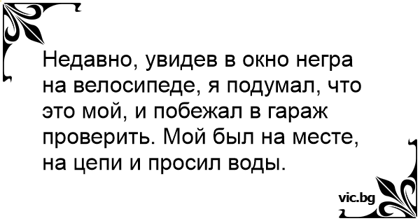 Недавно, увидев в окно негра на велосипеде, я подумал, что это мой, и побежал в гараж проверить. Мой был на месте, на цепи и просил воды.