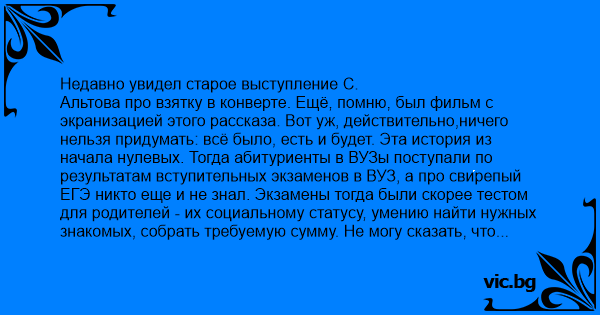 Альтова про взятку в конверте. Ещё, помню, был фильм с экранизацией этого рассказа. Вот уж, действительно,ничего нельзя придумать: всё было, есть и будет. Эта история из начала нулевых. Тогда абитуриенты в ВУЗы поступали по результатам вступительных экзаменов в ВУЗ, а про свирепый ЕГЭ никто еще и не знал. Экзамены тогда были скорее тестом для родителей - их социальному статусу, умению найти нужных знакомых, собрать требуемую сумму. Не могу сказать, что это были самые счастливые времена для вузовских преподов, но, если пристроить своего человечка, размер родительской благодарности превышал зарплату препода за год. А, если двух...Тогда препод мог недели две чувствовать себя новым русским: купить жене сапоги, съездить в Турцию, раздать почти все долги. И, кстати, почему-то поступившие студенты неплохо учились. Может, родителей было жалко? До поры до времени правоохранительные органы это особенно не волновало: если и появлялись какие-то статьи в прессе и разоблачительные передачи на ТВ, то это служило только источником информации для родителей о размере взятки. Но как раз в начале нулевых всё переменилось: менты стали хватать взяточников с обязательным шоу - заламывание рук, выворачивание карманов и битьё взяточника мордой о стол. Ребята, для которых взятки были бизнесом, забеспокоились и побежали к знакомым "правоохранителям" за объяснениями. И выяснили, что раньше им запрещали привлекать врачей и учителей за взятки, а теперь дали команду "Фас". Дескать, теперь учителям да врачам что-то платят регулярно и прожить на эту сумму можно. Для сведения: в те времена треть преподавателей получала зарплату равную 2/3 от стоимости продуктовой корзины, рассчитанной, естественно, не домохозяйкой, а каким-то комитетом госдуры. Менты старались, но всё, что они могли - это организовать какую-нибудь подставу. И вот одна их барышня, решив поступать, нашла посредника - вахтёра одного из университетских корпусов. Когда вахтер получил требуемую сумму, менты пошли за ним следом, ожидая, что тот пойдет по всей коррупционной цепочке в приемную комиссию. Но тот их круто подвёл. Побежал в ближайший ларёк за бухлом и на неделю выпал из социума, уйдя в запой. Но делать что-то надо, и менты, не дождавшись, пошли в приёмную комиссию сами колоть её работников.