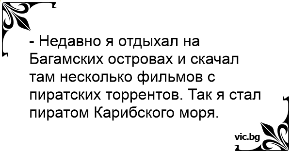- Недавно я отдыхал на Багамских островах и скачал там несколько фильмов с пиратских торрентов. Так я стал пиратом Карибского моря.