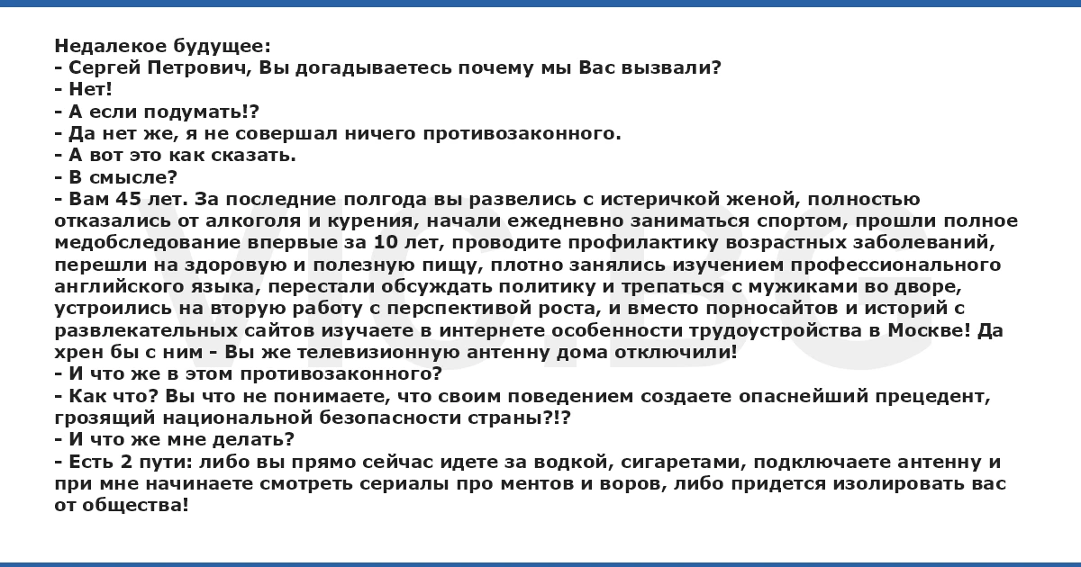 Недалекое будущее: - Сергей Петрович, Вы догадываетесь почему мы Вас вызвали? - Нет! - А если подумать!? - Да нет же, я не совершал ничего противозаконного. - А вот это как сказать. - В смысле? - Вам 45 лет. За последние полгода вы развелись с истеричкой женой, полностью отказались от алкоголя и курения, начали ежедневно заниматься спортом, прошли полное медобследование впервые за 10 лет, проводите профилактику возрастных заболеваний, перешли на здоровую и полезную пищу, плотно занялись изучением профессионального английского языка, перестали обсуждать политику и трепаться с мужиками во дворе, устроились на вторую работу с перспективой роста, и вместо порносайтов и историй с развлекательных сайтов изучаете в интернете особенности трудоустройства в Москве! Да хpeн бы с ним - Вы же телевизионную антенну дома отключили! - И что же в этом противозаконного? - Как что? Вы что не понимаете, что своим поведением создаете опаснейший прецедент, грозящий национальной безопасности страны?!? - И что же мне делать? - Есть 2 пути: либо вы прямо сейчас идете за водкой, сигаретами, подключаете антенну и при мне начинаете смотреть сериалы про ментов и воров, либо придется изолировать вас от общества!