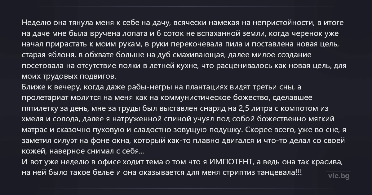 Неделю она тянула меня к себе на дачу, всячески намекая на непристойности, в итоге на даче мне была вручена лопата и 6 соток не вспаханной земли, когда черенок уже начал прирастать к моим рукам, в руки перекочевала пила и поставлена новая цель, старая яблоня, в обхвате больше на дуб смахивающая, далее милое создание посетовала на отсутствие полки в летней кухне, что расценивалось как новая цель, для моих трудовых подвигов. Ближе к вечеру, когда даже рабы-негры на плантациях видят третьи сны, а пролетариат молится на меня как на коммунистическое божество, сделавшее пятилетку за день, мне за труды был выставлен снаряд на 2,5 литра с компотом из хмеля и солода, далее я натруженной спиной учуял под собой божественно мягкий матрас и сказочно пуховую и сладостно зовущую подушку. Скорее всего, уже во сне, я заметил силуэт на фоне окна, который как-то плавно двигался и что-то делал со своей кожей, наверное снимал с себя... И вот уже неделю в офисе ходит тема о том что я ИМПОТЕНТ, а ведь она так красива, на ней было такое бельё и она оказывается для меня стриптиз танцевала!!!