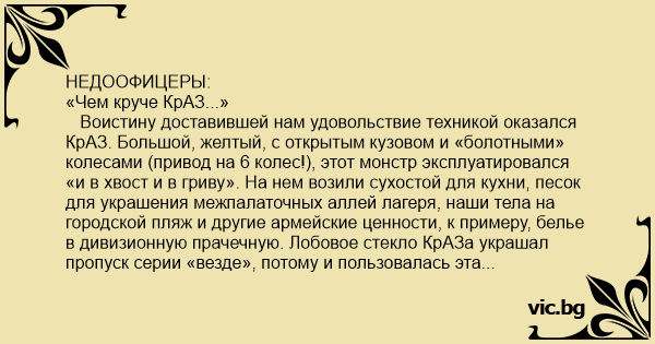НЕДООФИЦЕРЫ: «Чем круче КрАЗ...» Воистину доставившей нам удовольствие техникой оказался КрАЗ. Большой, желтый, с открытым кузовом и «болотными» колесами (привод на 6 колес!), этот монстр эксплуатировался «и в хвост и в гриву». На нем возили сухостой для кухни, песок для украшения межпалаточных аллей лагеря, наши тела на городской пляж и другие армейские ценности, к примеру, белье в дивизионную прачечную. Лобовое стекло КрАЗа украшал пропуск серии «везде», потому и пользовалась эта машинка повышенным спросом у лагерных офицеров, а так же уважением постовых соседних частей. ГАИшники его тоже не тормозили. Управлял монстром Вова. Очень опытный, грамотный водила, любящий вверенную ему дизельную технику еще со времен срочной службы, не лишенный чувства юмора и оптимизма. Очередным трудовым утром Вова забрал кухонный наряд и упылил за дровами, сухостоем, который накапливается с годами на танковом полигоне в виде деревьев, поваленных стреляными болванками. Не знаю, может, не пустили Вову на полигон ввиду стрельб, или еще по какой причине, но, где-то через полчаса в гараж прибегает один из «нарядных» с сообщением от Вовы, что тот «засел». Кхе… «Засадить» болотный КрАЗ на шестиприводном шасси – это надо суметь, подумалось нам, но зампотеху мы пока решили ничего не сообщать. Индифферентной рысью, стараясь не привлекать внимание, мы рванули за курьером, благо было недалеко. Вова (в смысле - КрАЗ) засел в узкой лесной просеке, не доехав до выезда с просеки всего-то метров сто. Засел конкретно, ибо последняя из ложбинок, часть которых Вова таки преодолел, по первому впечатлению, представляла собой нечто сродни танковому капониру. Капониру, зачем-то заполненному жижей, с консистенцией «что-то вроде деревенской сметаны». С расстояния десяти метров виднелась только верхняя часть кабины КрАЗа, на которой курил унылый Вова. Уровень «сметаны» был ровно по низ дверок, кабину не залило – и то хорошо. Весь наряд усердно собирал по окрестностям ошметки деревьев и веток, пытаясь запихать (утопить) их в область предполагаемых колес монстра. Ни ветки, ни деревья в «сметану» лезть не хотели, а если и лезли, то тут же медленно всплывали. - Вертолет придется вызывать, - мрачно шутканул Вова. Мы дружно посоветовали ему сплюнуть и заводить тачку. Сколько могли, дружной оравой затопили собранные стволы и ветки под колеса. Вова погазовал, подняв красивые булькающие буруны, но бревна не всплыли – очевидно, углубились в бездну, а КрАЗ даже не шевельнулся. Отрядили бойцов за новой древесиной. Вова вылез и на всякий пожарный уведомил нас, что набранный было за поездку полный кузов дров для кухни уже утоплен под КрАЗом. Перекурили, повторили опыт по затоплению дров (бездна оказалось бездонной), заглушили, сели думать. - Точно вертолет придется вызывать. Кто-нить в курсе, кстати, есть тут поблизости вертолетные части? – начал было гнуть свое Вова, но был некрасиво обруган и, обидевшись, пошел отлить. Ничего технологичнее вертолета нам головы уже не лезло, а посему решено было все-таки идти доложиться зампотеху. Я пошел сам. Как можно мягче, издалека и без красок, принялся рассказывать ему, какие случаются приколы с техникой, и уже через пять минут мы с зампотехом были возле КрАЗа. Что-то пробормотав в адрес всех наших родственников до седьмого колена, зампотех убыл, посоветовав