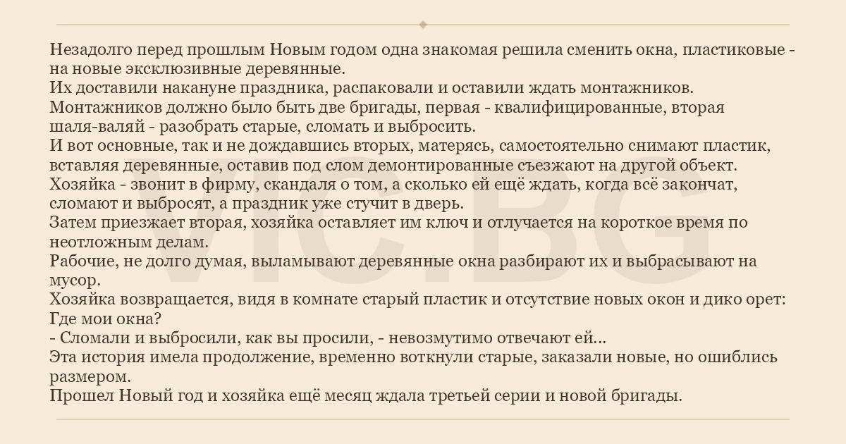 Хозяйка возвращается, видя в комнате старый пластик и отсутствие новых окон и дико орет: Где мои окна?