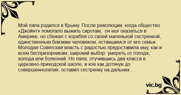Мой папа родился в Крыму. После революции, когда общество «Джойнт» помогало выжить сиротам, он мог оказаться в Америке, но сбежал с корабля со своей маленькой сестренкой, единственным близким человеком, оставшимся от его семьи.