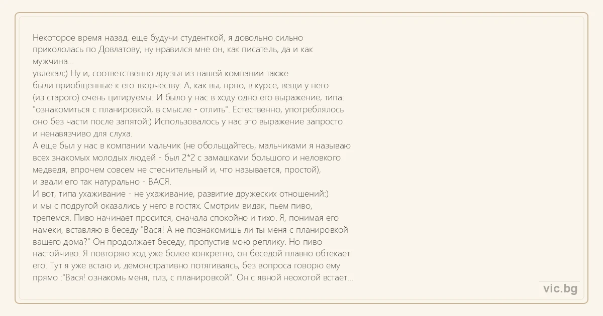 мужчина... увлекал;) Ну и, соответственно друзья из нашей компании также были приобщенные к его творчеству. А, как вы, нрно, в курсе, вещи у него (из старого) очень цитируемы. И было у нас в ходу одно его выражение, типа: "ознакомиться с планировкой, в смысле - отлить". Естественно, употреблялось оно без части после запятой:) Использовалось у нас это выражение запросто и ненавязчиво для слуха. А еще был у нас в компании мальчик (не обольщайтесь, мальчиками я называю всех знакомых молодых людей - был 2*2 с замашками большого и неловкого медведя, впрочем совсем не стеснительный и, что называется, простой), и звали его так натурально - ВАСЯ. И вот, типа ухаживание - не ухаживание, развитие дружеских отношений:) и мы с подругой оказались у него в гостях. Смотрим видак, пьем пиво, трепемся. Пиво начинает просится, сначала спокойно и тихо. Я, понимая его намеки, вставляю в беседу "Вася! А не познакомишь ли ты меня с планировкой вашего дома?" Он продолжает беседу, пропустив мою реплику. Но пиво настойчиво. Я повторяю ход уже более конкретно, он беседой плавно обтекает его. Тут я уже встаю и, демонстративно потягиваясь, без вопроса говорю ему прямо :"Вася! ознакомь меня, плз, с планировкой". Он с явной неохотой встает (отмазаться уже невозможно) "Ну что тебе так пригорела эта планировка! - самая стандартная ", и далее, идя чуть впереди меня "тут - комната родителей, тут - я с сестрой живу" и, придерживая меня за руку "там - кухня и совсем неинтересно, ванная и ТУАЛЕТ" и тянет ОТТУДА! "Вася! Постой! Это же самое интересное:)". Я до последного не могла поверить, что он меня просто не понял! PS. Кстати, он и его приятели для этих целей использовали выражение "пойти, позвонить" , а я долго не могла понять, кому они так часто звонят, когда мы гуляли, и как хорошо они знают город - они знали местонахождение телефонов- автоматов в совершенно диких и мной неопознанных районах города!;))