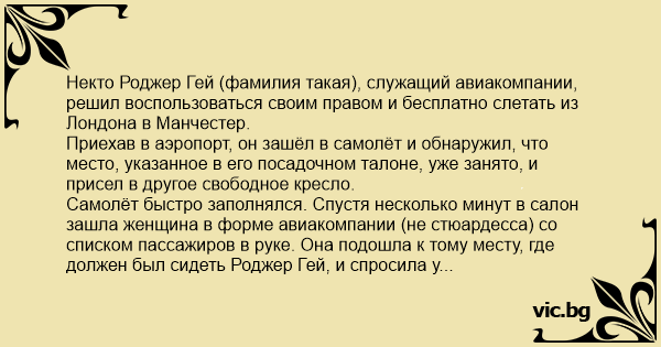 Некто Роджер Гeй (фамилия такая), служащий авиакомпании, решил воспользоваться своим правом и бесплатно слетать из Лондона в Манчестер.