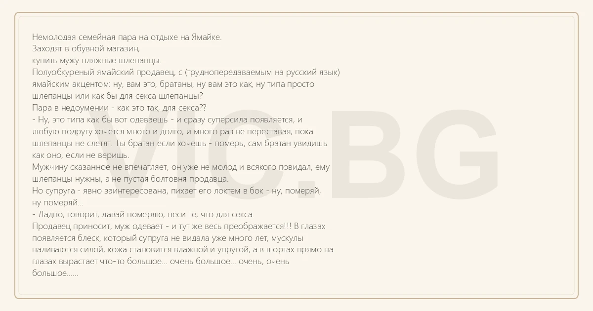 Немолодая семейная пара на отдыхе на Ямайке. Заходят в обувной магазин, купить мужу пляжные шлепанцы. Полуобкуреный ямайский продавец, с (труднопередаваемым на русский язык) ямайским акцентом: ну, вам это, братаны, ну вам это как, ну типа просто шлепанцы или как бы для cekca шлепанцы? Пара в недоумении - как это так, для cekca?? - Ну, это типа как бы вот одеваешь - и сразу суперсила появляется, и любую подругу хочется много и долго, и много раз не переставая, пока шлепанцы не слетят. Ты братан если хочешь - померь, сам братан увидишь как оно, если не веришь. Мужчину сказанное не впечатляет, он уже не молод и всякого повидал, ему шлепанцы нужны, а не пустая болтовня продавца. Но супруга - явно заинтересована, пихает его локтем в бок - ну, померяй, ну померяй... - Ладно, говорит, давай померяю, неси те, что для cekca. Продавец приносит, муж одевает - и тут же весь преображается!!! В глазах появляется блеск, который супруга не видала уже много лет, мускулы наливаются силой, кожа становится влажной и упругой, а в шортах прямо на глазах вырастает что-то большое... очень большое... очень, очень большое... И тут муж хватает продавца, одним движением срывает с него штаны, бросает на прилавок, и... Супруга в шоке, прилавок едва не разваливается от энергичных движений, а муж ничего вокруг не видит и не слышит. Продавец орет на весь магазин под ритм происходящего: БРА-ТА-А-А-АН, НЕ-НА-ТУ-НО-ГУ-О-ДЕЛ, НЕ-НА-ТУ-НО-О-О-О-О-О-ГУ!!!