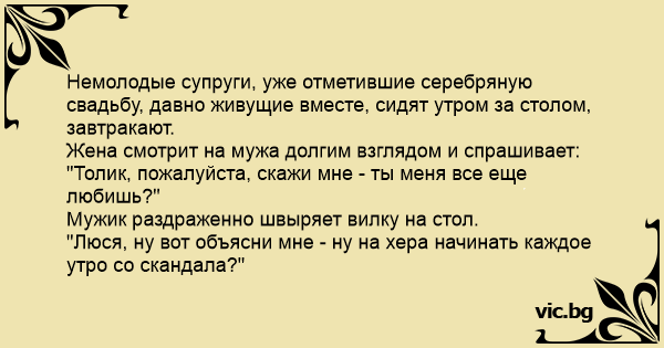 Немолодые супруги, уже отметившие серебряную свадьбу, давно живущие вместе, сидят утром за столом, завтракают.