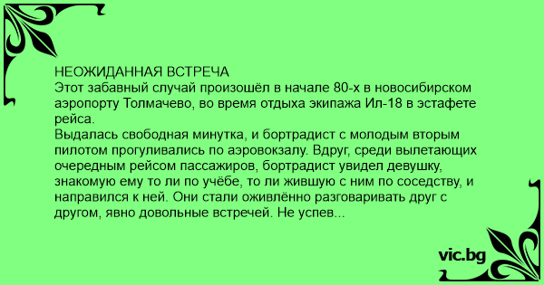 НЕОЖИДАННАЯ ВСТРЕЧА Этот забавный случай произошёл в начале 80-х в новосибирском аэропорту Толмачево, во время отдыха экипажа Ил-18 в эстафете рейса.