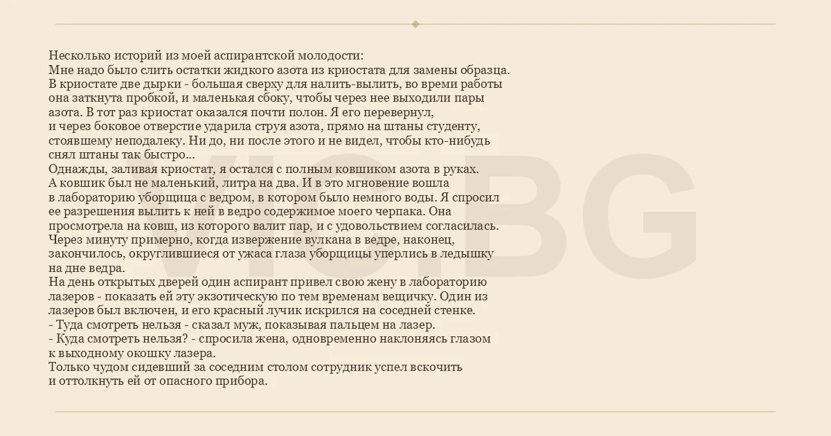 Несколько историй из моей аспирантской молодости: Мне надо было слить остатки жидкого азота из криостата для замены образца. В криостате две дырки - большая сверху для налить-вылить, во времи работы она заткнута пробкой, и маленькая сбоку, чтобы через нее выходили пары азота. В тот раз криостат оказался почти полон. Я его перевернул, и через боковое отверстие ударила струя азота, прямо на штаны студенту, стоявшему неподалеку. Ни до, ни после этого и не видел, чтобы кто-нибудь снял штаны так быстро... Однажды, заливая криостат, я остался с полным ковшиком азота в руках. А ковшик был не маленький, литра на два. И в это мгновение вошла в лабораторию уборщица с ведром, в котором было немного воды. Я спросил ее разрешения вылить к ней в ведро содержимое моего черпака. Она просмотрела на ковш, из которого валит пар, и с удовольствием согласилась. Через минуту примерно, когда извержение вулкана в ведре, наконец, закончилось, округлившиеся от ужаса глаза уборщицы уперлись в ледышку на дне ведра. На день открытых дверей один аспирант привел свою жену в лабораторию лазеров - показать ей эту экзотическую по тем временам вещичку. Один из лазеров был включен, и его красный лучик искрился на соседней стенке. - Туда смотреть нельзя - сказал муж, показывая пальцем на лазер. - Куда смотреть нельзя? - спросила жена, одновременно наклоняясь глазом к выходному окошку лазера. Только чудом сидевший за соседним столом сотрудник успел вскочить и оттолкнуть ей от опасного прибора.
