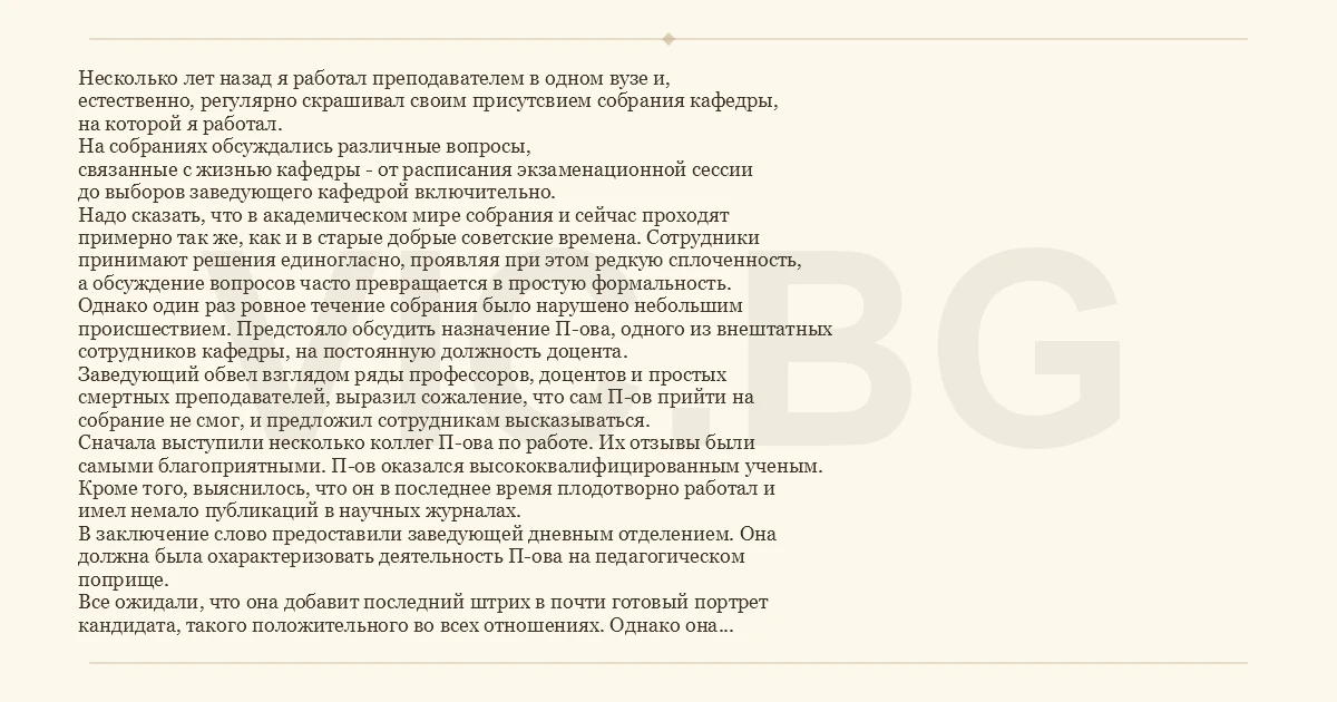 Несколько лет назад я работал преподавателем в одном вузе и, естественно, регулярно скрашивал своим присутсвием собрания кафедры, на которой я работал. На собраниях обсуждались различные вопросы, связанные с жизнью кафедры - от расписания экзаменационной сессии до выборов заведующего кафедрой включительно. Надо сказать, что в академическом мире собрания и сейчас проходят примерно так же, как и в старые добрые советские времена. Сотрудники принимают решения единогласно, проявляя при этом редкую сплоченность, а обсуждение вопросов часто превращается в простую формальность. Однако один раз ровное течение собрания было нарушено небольшим происшествием. Предстояло обсудить назначение П-ова, одного из внештатных сотрудников кафедры, на постоянную должность доцента. Заведующий обвел взглядом ряды профессоров, доцентов и простых смертных преподавателей, выразил сожаление, что сам П-ов прийти на собрание не смог, и предложил сотрудникам высказываться. Сначала выступили несколько коллег П-ова по работе. Их отзывы были самыми благоприятными. П-ов оказался высококвалифицированным ученым. Кроме того, выяснилось, что он в последнее время плодотворно работал и имел немало публикаций в научных журналах. В заключение слово предоставили заведующей дневным отделением. Она должна была охарактеризовать деятельность П-ова на педагогическом поприще. Все ожидали, что она добавит последний штрих в почти готовый портрет кандидата, такого положительного во всех отношениях. Однако она оказалась человеком на редкость принципиальным, и не упустила возможности высказать о П-ове все, что она о нем думает. По ее словам выходило, что П-ов относится к занятиям небрежно, и один раз, уехав без предупреждения в командировку, пропустил занятие, нанеся этим непоправимый удар по знаниям своих студентов. Зав. кафедрой был и сам не рад, что предоставил ей слово. Портрет кандидата получился сильно смазанным. - Скажите, Ольга Васильевна, были ли какие-нибудь ЧП за время работы П-ова? - спросил он, поморщившись и делая ударение на слове "ЧП". Ольга Васильевна хотела было ответить, но зав. кафедрой, видимо, прочитал на ее лице что-то не то и поспешно добавил: - ЧП - это когда преподаватель в течение нескольких недель без объяснения причин не является на занятия. Ольге Васильевне, загнанной в угол таким непомерно жестким условием, ничего не оставалось, кроме как подтвердить, что никаких ЧП не было. После этого П-ов, к общему удовольствию, был единогласно избран на должность доцента.