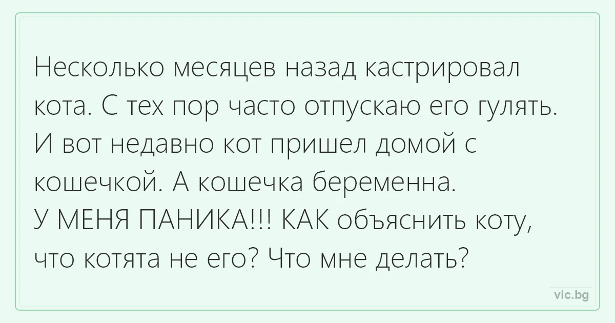 Несколько месяцев назад кастрировал кота. С тех пор часто отпускаю его гулять. И вот недавно кот пришел домой с кошечкой. А кошечка беременна.<br />У МЕНЯ ПАНИКА!!! КАК объяснить коту, что котята не его? Что мне делать?