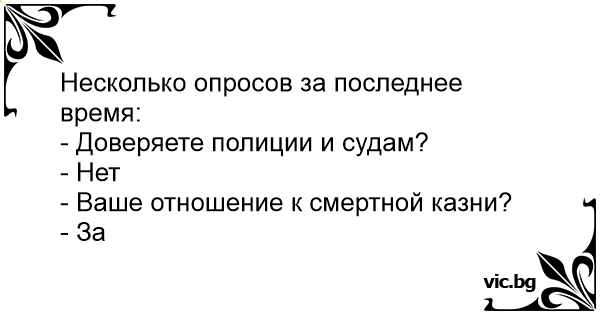Несколько опросов за последнее время:<br />- Доверяете полиции и судам?<br />- Нет<br />- Ваше отношение к смертной казни?<br />- За