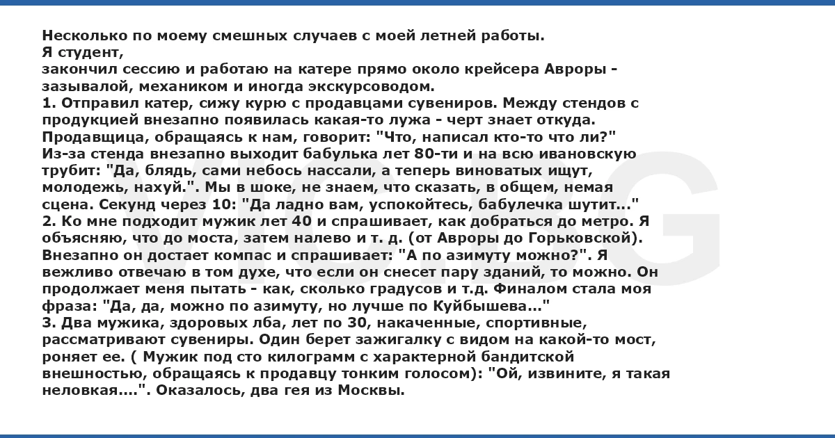 Несколько по моему смешных случаев с моей летней работы. Я студент, закончил сессию и работаю на катере прямо около крейсера Авроры - зазывалой, механиком и иногда экскурсоводом. 1. Отправил катер, сижу курю с продавцами сувениров. Между стендов с продукцией внезапно появилась какая-то лужа - черт знает откуда. Продавщица, обращаясь к нам, говорит: "Что, написал кто-то что ли?" Из-за стенда внезапно выходит бабулька лет 80-ти и на всю ивановскую трубит: "Да, блядь, сами небось нассали, а теперь виноватых ищут, молодежь, нахуй.". Мы в шоке, не знаем, что сказать, в общем, немая сцена. Секунд через 10: "Да ладно вам, успокойтесь, бабулечка шутит..." 2. Ко мне подходит мужик лет 40 и спрашивает, как добраться до метро. Я объясняю, что до моста, затем налево и т. д. (от Авроры до Горьковской). Внезапно он достает компас и спрашивает: "А по азимуту можно?". Я вежливо отвечаю в том духе, что если он снесет пару зданий, то можно. Он продолжает меня пытать - как, сколько градусов и т.д. Финалом стала моя фраза: "Да, да, можно по азимуту, но лучше по Куйбышева..." 3. Два мужика, здоровых лба, лет по 30, накаченные, спортивные, рассматривают сувениры. Один берет зажигалку с видом на какой-то мост, роняет ее. ( Мужик под сто килограмм с характерной бандитской внешностью, обращаясь к продавцу тонким голосом): "Ой, извините, я такая неловкая....". Оказалось, два гея из Москвы.
