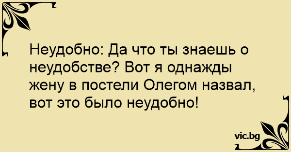 Неудобно: Да что ты знаешь о неудобстве? Вот я однажды жену в постели Олегом назвал, вот это было неудобно!