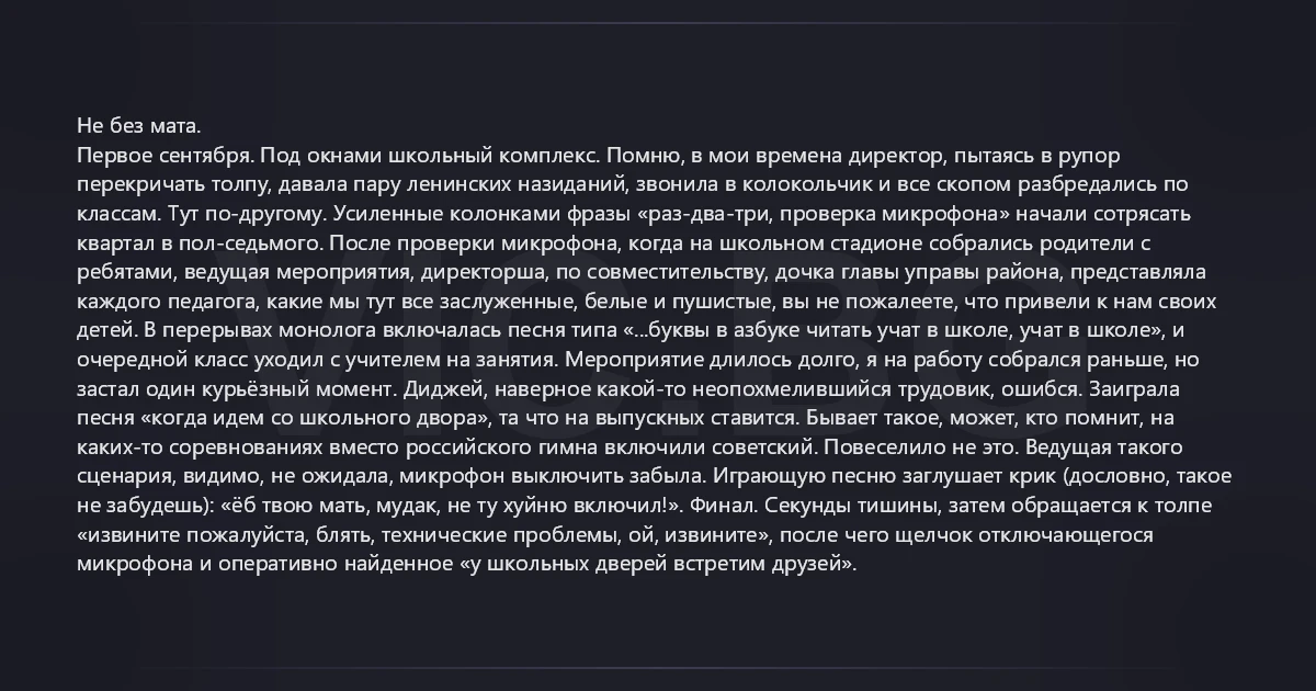 Не без мата. Первое сентября. Под окнами школьный комплекс. Помню, в мои времена директор, пытаясь в рупор перекричать толпу, давала пару ленинских назиданий, звонила в колокольчик и все скопом разбредались по классам. Тут по-другому. Усиленные колонками фразы «раз-два-три, проверка микрофона» начали сотрясать квартал в пол-седьмого. После проверки микрофона, когда на школьном стадионе собрались родители с ребятами, ведущая мероприятия, директорша, по совместительству, дочка главы управы района, представляла каждого педагога, какие мы тут все заслуженные, белые и пушистые, вы не пожалеете, что привели к нам своих детей. В перерывах монолога включалась песня типа «...буквы в азбуке читать учат в школе, учат в школе», и очередной класс уходил с учителем на занятия. Мероприятие длилось долго, я на работу собрался раньше, но застал один курьёзный момент. Диджей, наверное какой-то неопохмелившийся трудовик, ошибся. Заиграла песня «когда идем со школьного двора», та что на выпускных ставится. Бывает такое, может, кто помнит, на каких-то соревнованиях вместо российского гимна включили советский. Повеселило не это. Ведущая такого сценария, видимо, не ожидала, микрофон выключить забыла. Играющую песню заглушает крик (дословно, такое не забудешь): «ёб твою мать, mудak, не ту хуйню включил!». Финал. Секунды тишины, затем обращается к толпе «извините пожалуйста, бляtь, технические проблемы, ой, извините», после чего щелчок отключающегося микрофона и оперативно найденное «у школьных дверей встретим друзей».