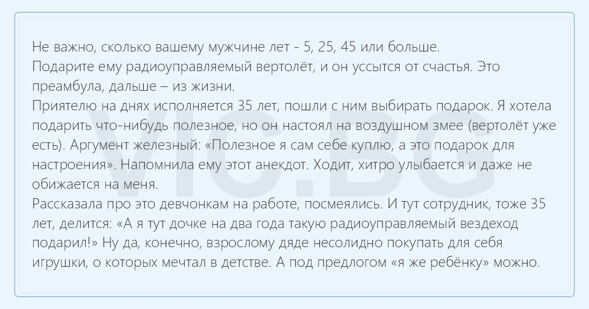 Приятелю на днях исполняется 35 лет, пошли с ним выбирать подарок. Я хотела подарить что-нибудь полезное, но он настоял на воздушном змее (вертолёт уже есть). Аргумент железный: «Полезное я сам себе куплю, а это подарок для настроения». Напомнила ему этот анекдот. Ходит, хитро улыбается и даже не обижается на меня.