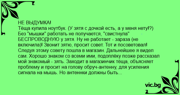Тёща купила ноутбук. (У зятя с дочкой есть, а у меня нету!?) Без "мышки" работать не получается, "свистнула" БЕСПРОВОДНУЮ у зятя. Ну не работает - зараза (не включила)! Звонит зятю, просит совет. Тот и посоветовал! Следуя этому совету пошла в магазин. Дальнейшее я видел сам. Хорошо знаком со всеми ими, подоплёку позже рассказал мой знакомый - зять. Заходит в магазинчик тёща, объясняет проблему и просит на голову обруч-антенну, для усиления сигнала на мышь. Но антеннки должны быть по бокам обруча не "рожками", а"тарелочками", так зять посоветовал! У двух продавцов тут же нашлось какое-то дело под прилавком; один из покупателей, что-то хрюкнув, спиной сполз по стенке на пол; ну а мне пришлось выскакивать из магазина, не хохотать же над знакомой в магазине! Три месяца зятёк жил спокойной жизнью, тёща не заходила и не звонила консультироваться.