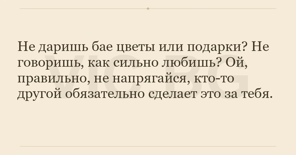 Не даришь бае цветы или подарки? Не говоришь, как сильно любишь? Ой, правильно, не напрягайся, кто-то другой обязательно сделает это за тебя.