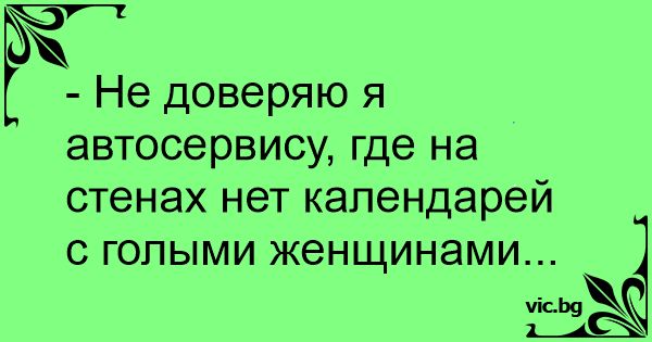 - Не доверяю я автосервису, где на стенах нет календарей с голыми женщинами...