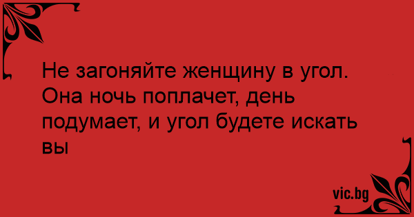 Не загоняйте женщину в угол. Она ночь поплачет, день подумает, и угол будете искать вы