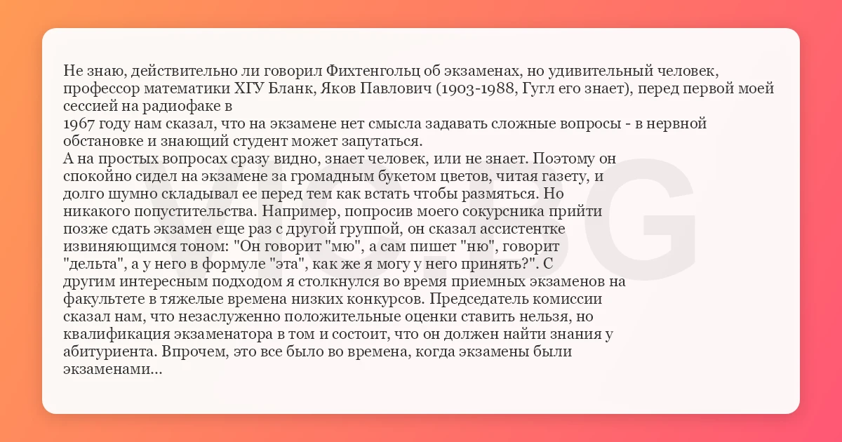 Не знаю, действительно ли говорил Фихтенгольц об экзаменах, но удивительный человек, профессор математики ХГУ Бланк, Яков Павлович (1903-1988, Гугл его знает), перед первой моей сессией на радиофаке в