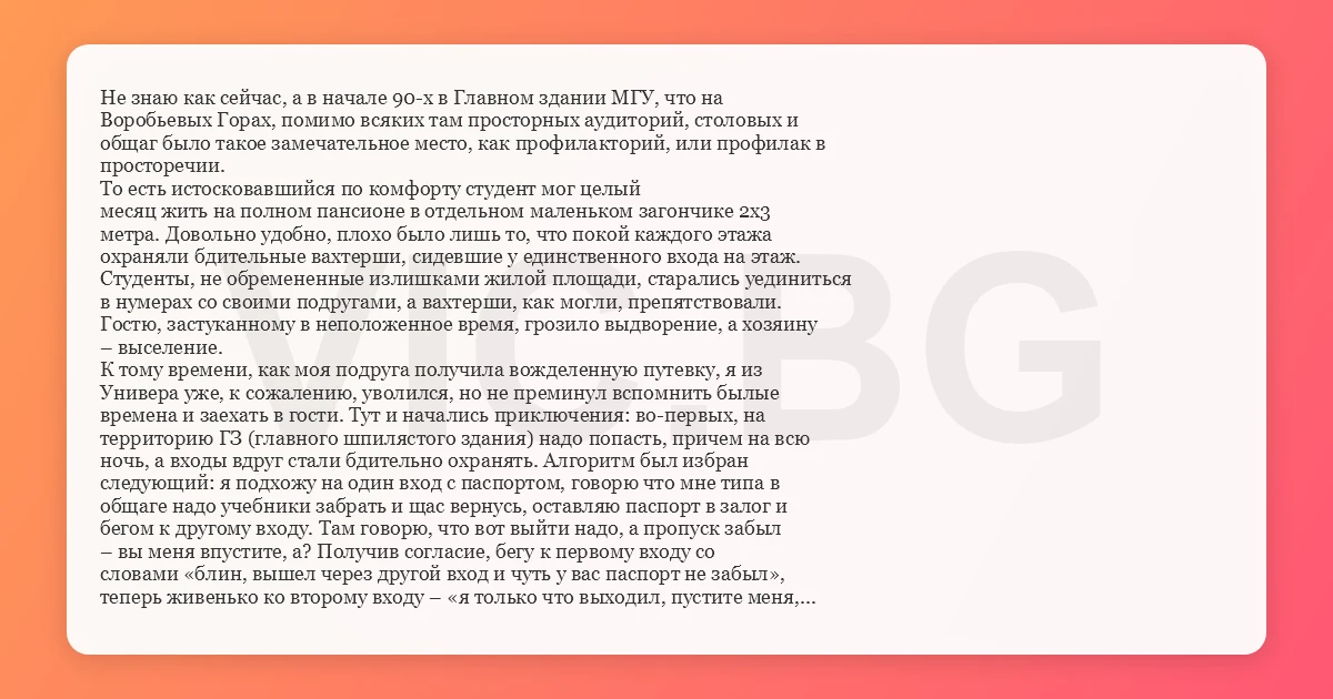 Не знаю как сейчас, а в начале 90-х в Главном здании МГУ, что на Воробьевых Горах, помимо всяких там просторных аудиторий, столовых и общаг было такое замечательное место, как профилакторий, или профилак в просторечии. То есть истосковавшийся по комфорту студент мог целый месяц жить на полном пансионе в отдельном маленьком загончике 2х3 метра. Довольно удобно, плохо было лишь то, что покой каждого этажа охраняли бдительные вахтерши, сидевшие у единственного входа на этаж. Студенты, не обремененные излишками жилой площади, старались уединиться в нумерах со своими подругами, а вахтерши, как могли, препятствовали. Гостю, застуканному в неположенное время, грозило выдворение, а хозяину – выселение. К тому времени, как моя подруга получила вожделенную путевку, я из Универа уже, к сожалению, уволился, но не преминул вспомнить былые времена и заехать в гости. Тут и начались приключения: во-первых, на территорию ГЗ (главного шпилястого здания) надо попасть, причем на всю ночь, а входы вдруг стали бдительно охранять. Алгоритм был избран следующий: я подхожу на один вход с паспортом, говорю что мне типа в общаге надо учебники забрать и щас вернусь, оставляю паспорт в залог и бегом к другому входу. Там говорю, что вот выйти надо, а пропуск забыл – вы меня впустите, а? Получив согласие, бегу к первому входу со словами «блин, вышел через другой вход и чуть у вас паспорт не забыл», теперь живенько ко второму входу – «я только что выходил, пустите меня, дяденьки!» :) И бегом в профилак. Там – свои приколы: злые бабки – вахтерши рыскают по обоим коридорам, но их бдительность усыпить удается, спрятав куртку в сумку и переобувшись в заранее припасенные тапочки. Добрался, короче, до цели. Сидим, мило беседуем, красота! Время пролетело незаметно, близилась полночь. Но вахтерши не дремали, судя по шарканью шагов и воплю «Немедленно откройте!!!». Немая сцена. Шаги командора, блин. Муж пошел за пивОм. Лихорадочно соображаю, куда лезть. Подруга тихо подходит к шкафу и с адским скрежетом открывает его дверь, указывая перстом в его якобы бездонные глубины. Я, представляя, как нелепо я туда буду, покряхтывая, заползать, как будет скрипеть закрываемая дверь, и куда заглянет в первую очередь потирающая сухонькие ручонки вахтерша, проникаюсь комизмом ситуации и начинаю тихо ржать. У подруги в глазах явное желание дать мне по башке. Окидываю глазами комнату. Следов моего пребывания не так уж много. Хватаю рюкзак и тихо лезу под кровать. Подруга начинает отпирать дверь, я с ужасом замечаю рядом с кроватью свои не маленькие сапоги и аккуратно ногой подтягиваю их к себе. Из-под кровати видна нижняя часть открытой двери и тапочки вахтерши. Интересно, что видно ей? А диалог происходит следующий: - Так это вы здесь живете??? - Ну да, я! - Хм, а мне казалось что здесь живет какой-то молодой человек!!! - Вы ошиблись, молодые люди живут в соседнем номере… Пыль лезет в нос, насилу удерживаюсь от чиха. Тапки шаркают в полуметре от меня, слышен звук открываемой двери шкафа. Озадаченное хмыканье разочарованного пожилого человека… - Значит, это вы здесь живете??? - Ну конечно! А что, вы кого-то ищете? - ДА! Спокойной ночи. Закрывается дверь. Выглядываю из-под кровати. Подруга беззвучно трясется. Я, наконец, чихаю в голос. Успокоиться не могли долго… Утром акуратно выхожу из номера, высовываю нос в коридор. В 