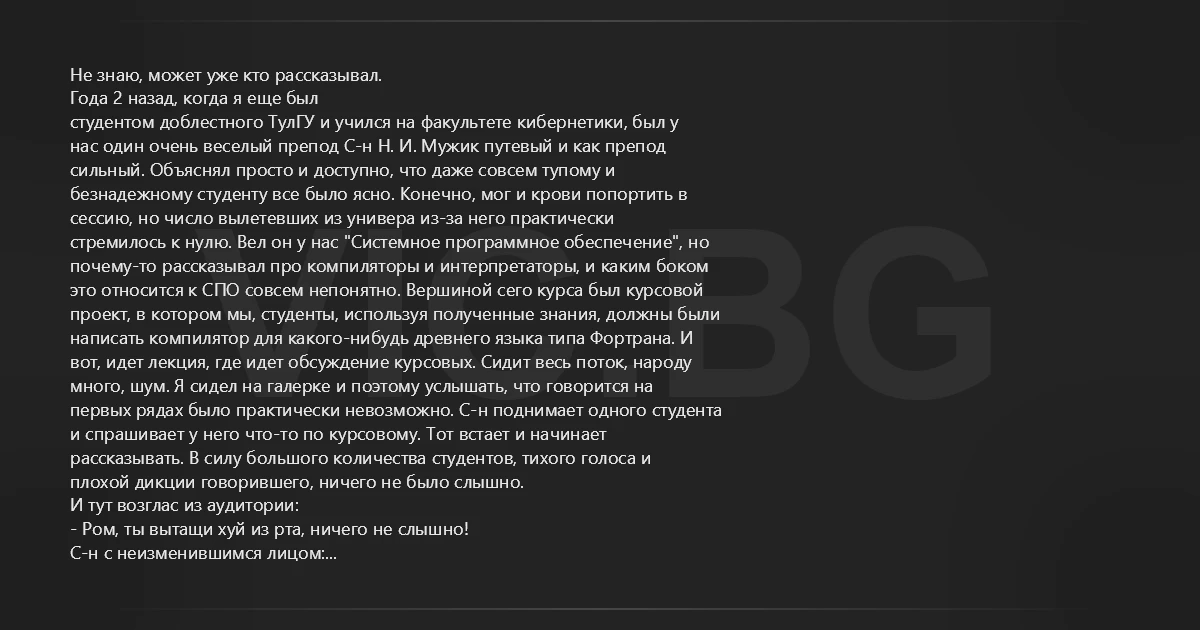 Не знаю, может уже кто рассказывал. Года 2 назад, когда я еще был студентом доблестного ТулГУ и учился на факультете кибернетики, был у нас один очень веселый препод С-н Н. И. Мужик путевый и как препод сильный. Объяснял просто и доступно, что даже совсем тупому и безнадежному студенту все было ясно. Конечно, мог и крови попортить в сессию, но число вылетевших из универа из-за него практически стремилось к нулю. Вел он у нас "Системное программное обеспечение", но почему-то рассказывал про компиляторы и интерпретаторы, и каким боком это относится к СПО совсем непонятно. Вершиной сего курса был курсовой проект, в котором мы, студенты, используя полученные знания, должны были написать компилятор для какого-нибудь древнего языка типа Фортрана. И вот, идет лекция, где идет обсуждение курсовых. Сидит весь поток, народу много, шум. Я сидел на галерке и поэтому услышать, что говорится на первых рядах было практически невозможно. С-н поднимает одного студента и спрашивает у него что-то по курсовому. Тот встает и начинает рассказывать. В силу большого количества студентов, тихого голоса и плохой дикции говорившего, ничего не было слышно. И тут возглас из аудитории: - Ром, ты вытащи хуй из рта, ничего не слышно! С-н с неизменившимся лицом: - Да, да, Ром, надо повнятней объяснять товарищам! Аудитория легла! Привет ТулГу!