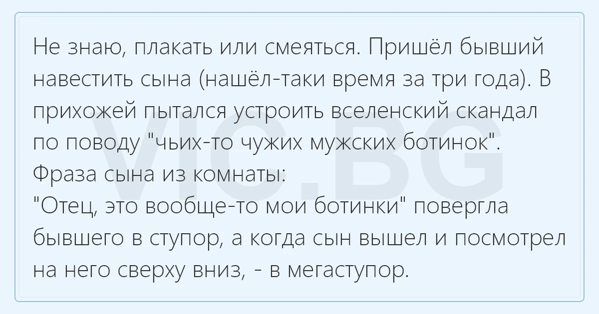 Не знаю, плакать или смеяться. Пришёл бывший навестить сына (нашёл-таки время за три года). В прихожей пытался устроить вселенский скандал по поводу "чьих-то чужих мужских ботинок". Фраза сына из комнаты: