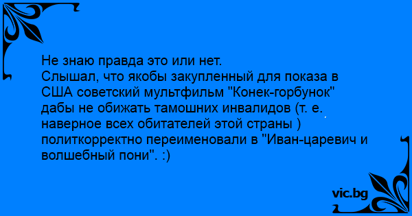 Слышал, что якобы закупленный для показа в США советский мультфильм "Конек-горбунок" дабы не обижать тамошних инвалидов (т. е. наверное всех обитателей этой страны ) политкорректно переименовали в "Иван-царевич и волшебный пони". :)