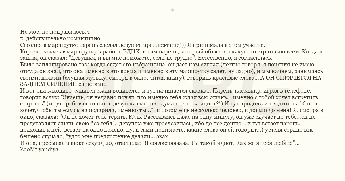 Не мое, но понравилось, т. к. действительно романтично. Сегодня в маршрутке парень сделал девушке предложение))) Я принимала в этом участие. Короче, сажусь в маршрутку в районе ВДНХ, и там парень, который объяснял какую-то стратегию всем. Когда я зашла, он сказал: "Девушка, и вы мне поможете, если не трудно". Естественно, я согласилась. Было запланировано так: когда сядет его избранница, он даст нам сигнал (честно говоря, я понятия не имею, откуда он знал, что она именно в это время и именно в эту маршрутку сядет, ну ладно), и мы начнем, занимаясь своими делами (слушая музыку, смотря в окно, читая книгу), говорить красивые слова... А ОН СПРЯЧЕТСЯ НА ЗАДНЕМ СИДЕНИИ с цветами. И вот она заходит... садится сзади водителя.. и тут начинается сказка... Парень-пассажир, играя в телефоне, говорит вслух: "Знаешь, он недавно понял, что именно тебя ждал всю жизнь... именно с тобой хочет встретить старость" (и тут гробовая тишина, девушка смеется, думая: "что за идиot?!) И тут продолжил водитель: "Он так хочет,чтобы ты ему сына подарила, именно ты...", и потом еще несколько человек, и дошло до меня! Я, смотря в окно, сказала: "Он не хочет тебя терять, Юль. Расставаясь даже на одну минуту, он уже скучает по тебе...он не представляет жизнь свою без тебя".. девушка уже прослезилась, ибо до нее дошло... и тут встает парень, подходит к ней, встает на одно колено, ну, и сами понимаете, какие слова он ей говорит...) у меня сердце так бешено стучало, будто мне предложение делали... ахах И она, пребывая в шоке секунд 20, ответила: "Я согласнаааааа. Ты такой идиot. Как же я тебя люблю"... ZooMflyandiya
