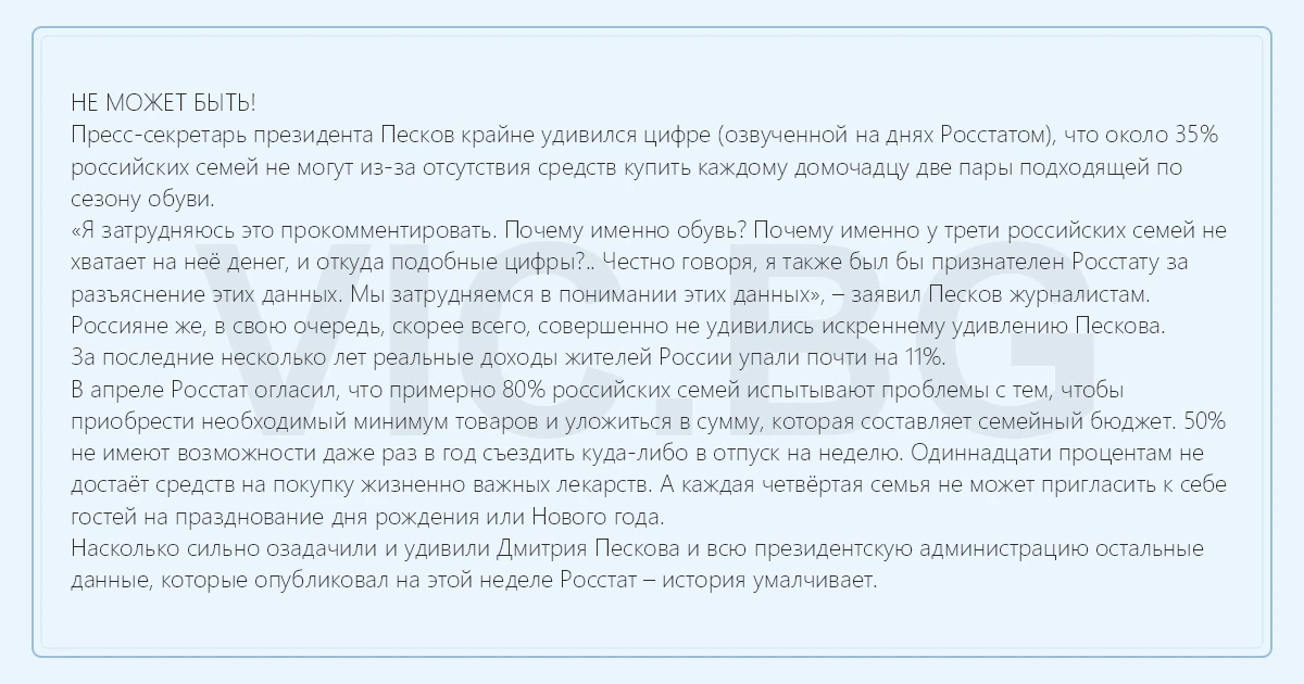 Пресс-секретарь президента Песков крайне удивился цифре (озвученной на днях Росстатом), что около 35% российских семей не могут из-за отсутствия средств купить каждому домочадцу две пары подходящей по сезону обуви.