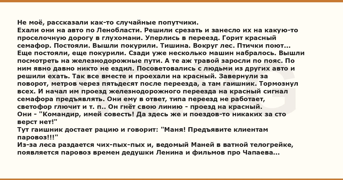 Не моё, рассказали как-то случайные попутчики. Ехали они на авто по Ленобласти. Решили срезать и занесло их на какую-то проселочную дорогу в глухомани. Уперлись в переезд. Горит красный семафор. Постояли. Вышли покурили. Тишина. Вокруг лес. Птички поют... Еще постояли, еще покурили. Сзади уже несколько машин набралось. Вышли посмотреть на железнодорожные пути. А те аж травой заросли по пояс. По ним явно давно никто не ездил. Посоветовались с людьми из других авто и решили ехать. Так все вместе и проехали на красный. Завернули за поворот, метров через пятьдесят после переезда, а там гаишник. Тормознул всех. И начал им проезд железнодорожного переезда на красный сигнал семафора предъявлять. Они ему в ответ, типа переезд не работает, светофор глючит и т. п.. Он гнёт свою линию - проезд на красный. Они - "Командир, имей совесть! Да здесь же и поездов-то никаких за сто верст нет!" Тут гаишник достает рацию и говорит: "Маня! Предъявите клиентам паровоз!!!" Из-за леса раздается чих-пых-пых и, ведомый Маней в ватной телогрейке, появляется паровоз времен дедушки Ленина и фильмов про Чапаева...