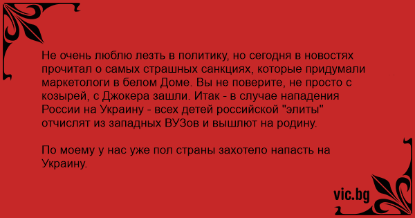 Не очень люблю лезть в политику, но сегодня в новостях прочитал о самых страшных санкциях, которые придумали маркетологи в белом Доме. Вы не поверите, не просто с козырей, с Джокера зашли. Итак - в случае нападения России на Украину - всех детей российской "элиты" отчислят из западных ВУЗов и вышлют на родину.